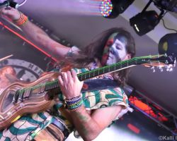 Back over to the Riffage stage for Vodun. This is an interesting set for a Friday afternoon, with the trio dressed up in full African tribal furs and war paint. Unfortunately the vocal levels for the lead singer were not great, I could just about hear the lead singer. This was not conducive in keeping the crowd interested and each song sounded the same as the previous. Next up on the Riffage stage were British rockers Departed. Producing a well-rehearsed set the guys worked the crowd well, and were growing it again after the depletion from Vodun’s set. Departed finished they set with a very well received rendition and sing-a-long of Queens Tie Your Mother Down.