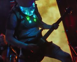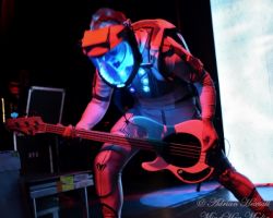 Surrounded by perspex screening, Adam Gilbert’s drum kit was shrouded in darkness until he sat down behind it with the familiar space suit outfit that the musicians in Starset are known for. The lights in his helmet glowing bright were further complimented by two large video screens either side of the stage that would display various images whilst the band played, mostly random imagery but acting as a great backdrop to both Ron DeChant on bass and lead guitarist Brock Richards both of whom utilise the screens to silhouette themselves as they play.