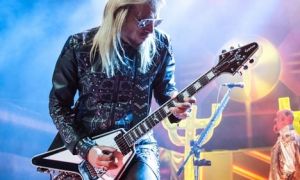 Rob Halford’s voice is an integral and obvious part of the band’s sound; he sang all the songs with tremendous vocal conviction and energy. In preparation for all the high notes, he would crouch down and let them erupt out of him like a volcano. His steel belted screams on “Evil Never Dies” and “Painkiller” were clear and strong sounding like the Halford of younger days. Rob’s trademark moment is when he comes out on his motorcycle for “Hell Bent for Leather.”