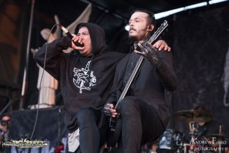 Boston’s Ice Nine Kills were next on Red Dawn stage. In front of a movie theatre styled set, the band created a horror film feel through their music and blood-soaked outfits. Lead singer Spencer Charnas took the fight to the crowd, jumping onto the barricade for a more in-your-face approach to match the tracks blasting behind him. Even Nekrogoblikon’s goblin couldn’t resist getting up close and personal with the act.