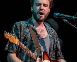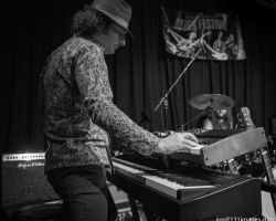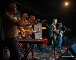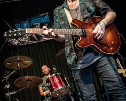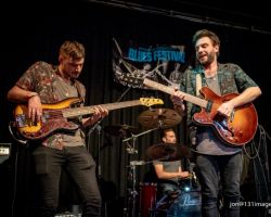 Taking the stage next were The Della Grants, a five-piece band from Leicester, founded in 2014 and fronted by old friends Max Manning and Tom Best. Their blend of laid-back rock, blues and Americana was amply demonstrated in their first two songs ‘Too Fast’ and ‘Wayward Man’ with keyboardist Tony Robinson breaking out the trumpet and [muffler] on the latter. The Hawaiian-style shirts the band wore somehow typified the lighter, musically more colourful sound that has become their trademark style. With Max and Tom sharing vocal and guitar duties and the rhythm section of Andy Boulton (bass) and Tom Walker (drums) having played together for over a decade, the band have both variety and a solid stage presence. In addition, they have a strong catalogue of original tracks, but aren’t afraid to dip into blues history and pluck Little Walter’s ‘Hate To See You Go’ out from the fifties – more recently covered by The Rolling Stones on their Blues and Lonesome album. Set staples ‘Gone’, ‘More Than Pray’ and ‘Midnight Special’ mixed up the tempo before the DGs (as they are known) finished with the high-energy ‘Red Mist’.